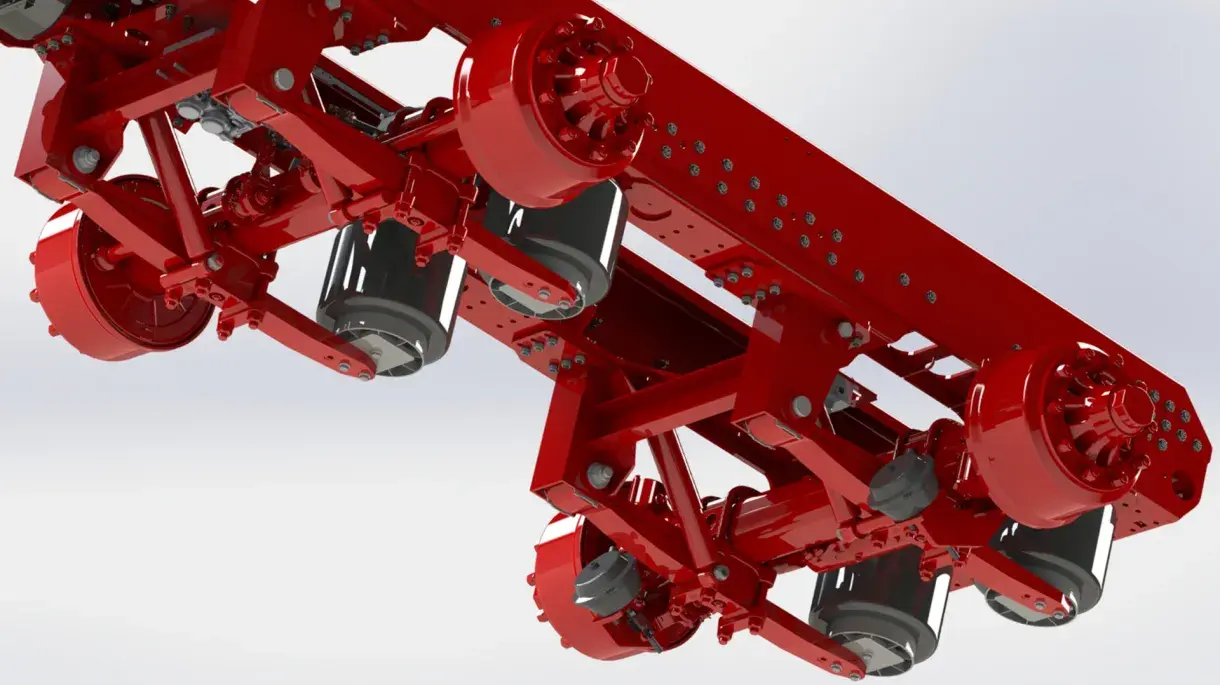 The trailer can be equipped with an air-suspended long bogie (1,820 mm) with air suspension on each axle. The suspension is equipped with 1 rigid and 1 steering axle. As such it brings the possibility to adjust the trailer height, for increased stability and strength. The trailer will run incredibly smoothly and nicely.