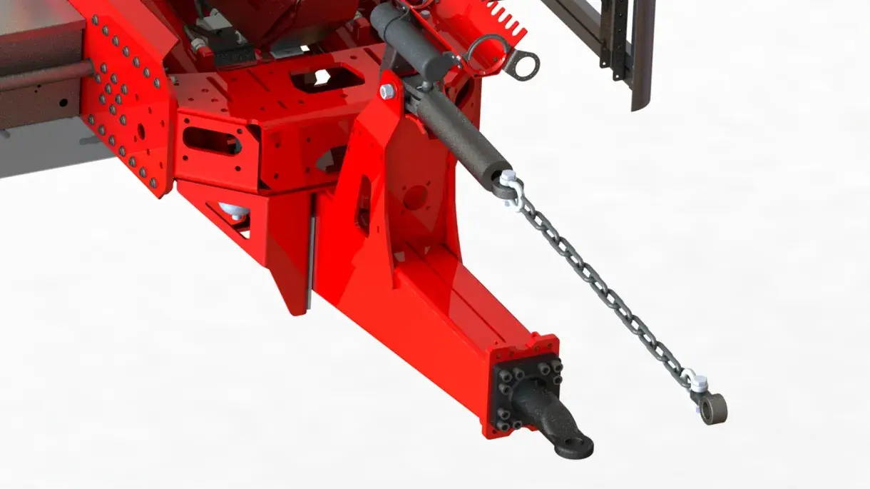 To limit the strain on the tractor and the towing eyelet one are able with the hydraulic frame lock to transfer the weight to the tractor at the pulling moment when the load eases of the ground. This feature can be seen as a weight transfer cylinder that works in conjunction with the bogie blocking (interaction does not occur with sprung bogie) and provides a more stable loading and increased safety margin. With the frame lock the whole of the tractor is used as a balance when hooking.